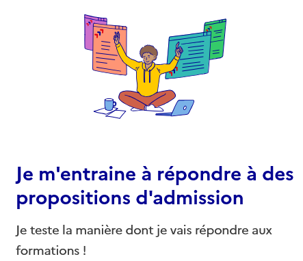 S'inscrire, formuler ses vœux et compléter son dossier : | Le site d'entraînement à la phase d'admission : Anticipez la phase d'admission qui débutera le 2 juin en consultant le site d'entraînement de Parcoursup : quiz, règles d'or et simulation de réponses ! |
