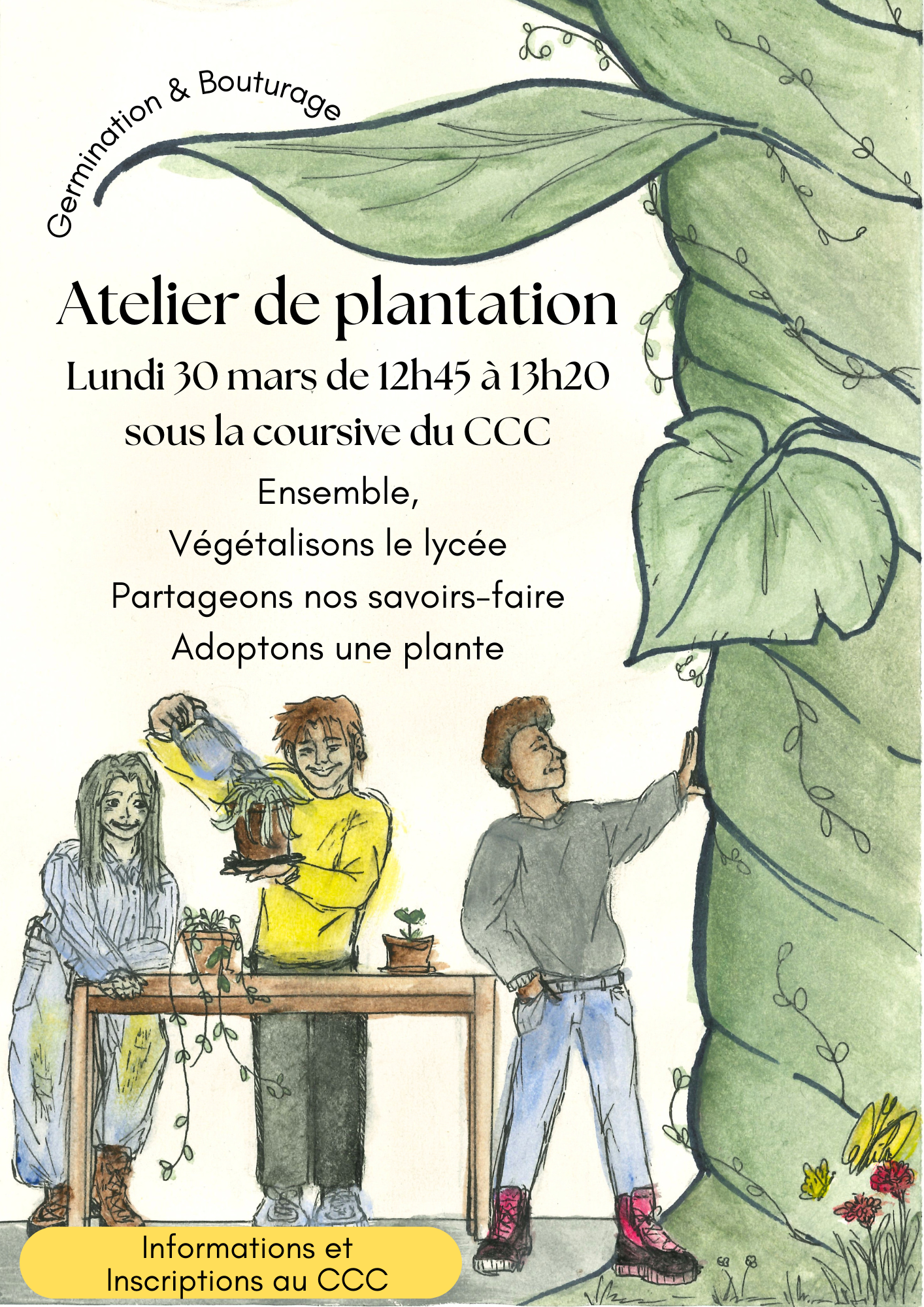Les élèves éco-délégués et d'autres membres de la communauté éducative vous proposent un atelier pour pratiquer le bouturage et la germination 🌱 Que vous soyez débutant ou expérimenté venez partager ce moment de plantation le lundi 30 mars de 12h45 à 13h20 sous la coursive du CCC. 🪴 Vous pouvez venir avec une plante à bouturer, une bouture ou des graines à faire germer. Vous pouvez venir avec vos petits outils de jardinage ou sans rien ! Les objectifs de cet atelier sont de partager nos savoirs-faire mais aussi de faire pousser des plantes pour les installer ensuite dans les salles de classes et les bâtiments. Vous pourrez adopter une plante qui restera au lycée et dont vous devrez vous occuper ou bien la ramener chez vous pour oxygéner votre quotidien. Les boutures pourront être placées dans une salle de classe où vous allez régulièrement ou déposées dans des lieux sous surveillance tels que la Vie Scolaire, la MDL, l'accueil, l'administration ou le CCC 🌼🌷🌻🌹 Il sera également possible d'emporter une bouture chez vous. Inscrivez-vous ici 🌳 |